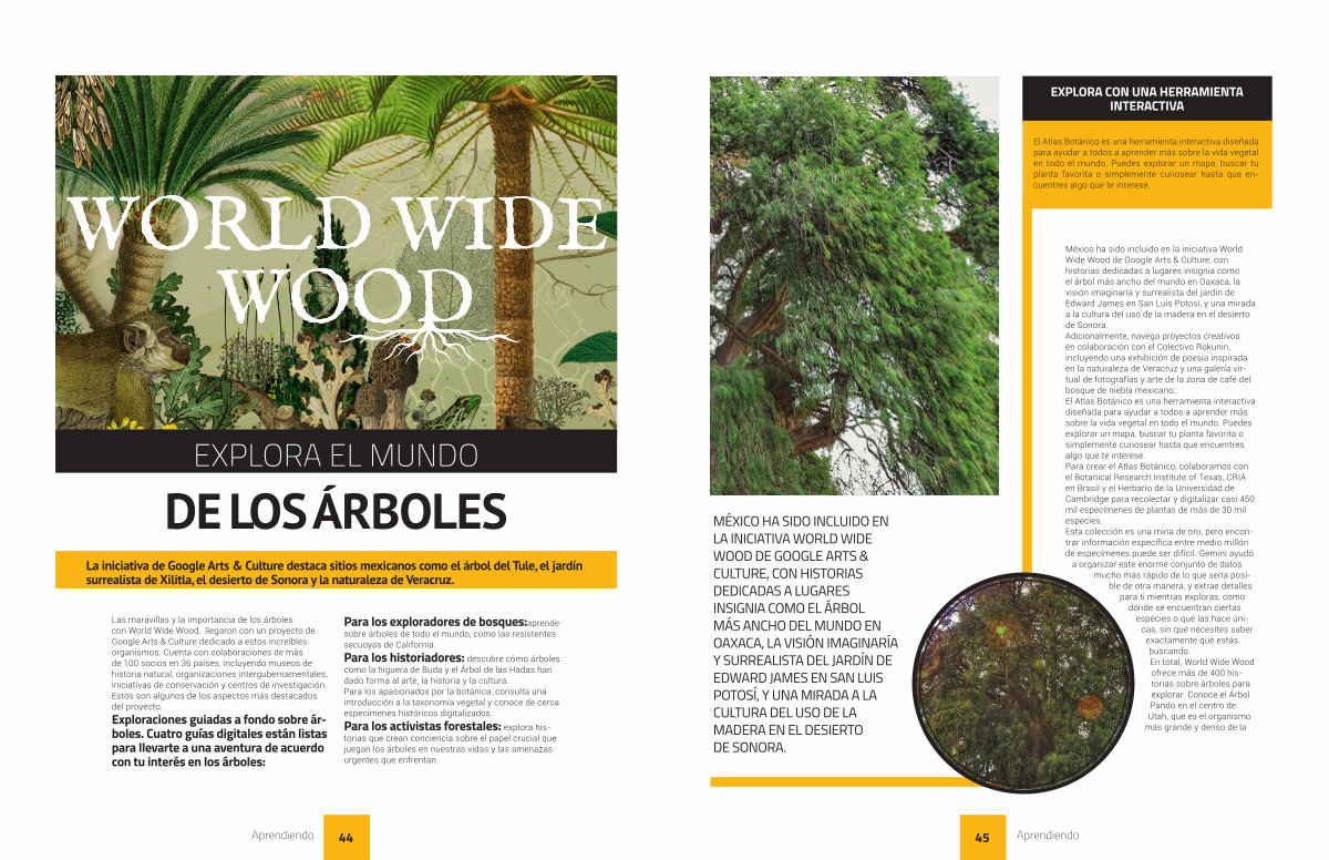 MÉXICO HA SIDO INCLUIDO EN LA INICIATIVA WORLD WIDE WOOD DE GOOGLE ARTS & CULTURE, CON HISTORIAS DEDICADAS A LUGARES INSIGNIA COMO EL ÁRBOL MÁS ANCHO DEL MUNDO EN OAXACA, LA VISIÓN IMAGINARÍA Y SURREALISTA DEL JARDÍN DE EDWARD JAMES EN SAN LUIS POTOSÍ, Y UNA MIRADA A LA CULTURA DEL USO DE LA MADERA EN EL DESIERTO DE SONORA.