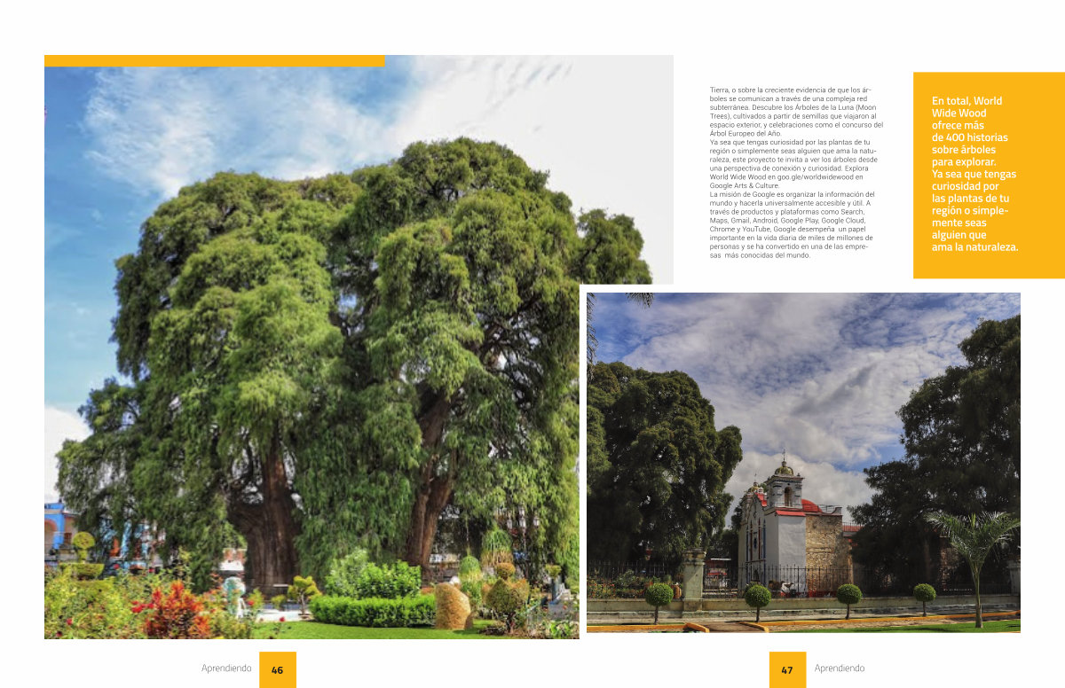 Tierra, o sobre la creciente evidencia de que los árboles se comunican a través de una compleja red subterránea. Descubre los Árboles de la Luna( Moon Trees), cultivados a partir de semillas que viajaron al espacio exterior, y celebraciones como el concurso del Árbol Europeo del Año. Ya sea que tengas curiosidad por las plantas de tu región o simplemente seas alguien que ama la naturaleza, este proyecto te invita a ver los árboles desde una perspectiva de conexión y curiosidad. Explora World Wide Wood en goo. gle / worldwidewood en Google Arts & Culture. La misión de Google es organizar la información del mundo y hacerla universalmente accesible y útil. A través de productos y plataformas como Search, Maps, Gmail, Android, Google Play, Google Cloud, Chrome y YouTube, Google desempeña un papel importante en la vida diaria de miles de millones de personas y se ha convertido en una de las empresas más conocidas del mundo.