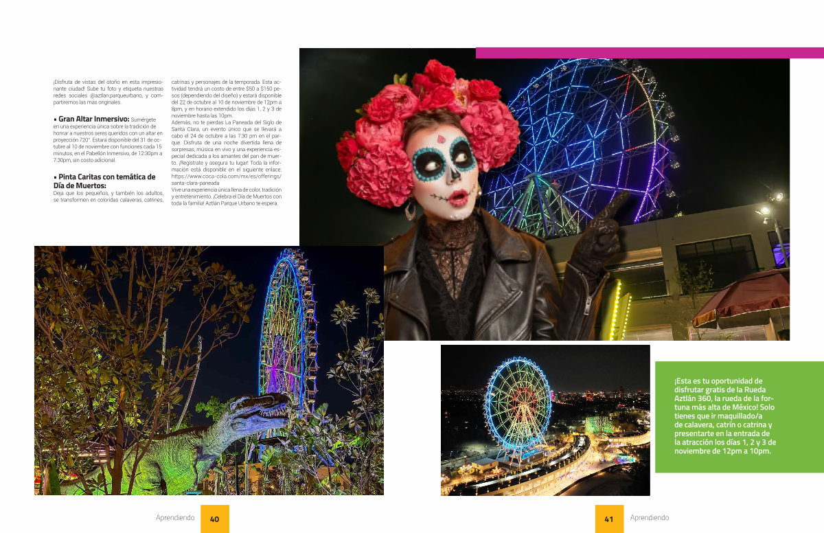 Deja que los pequeños , y también los adultos , se transformen en coloridas calaveras , catrines , catrinas y personajes de la temporada . Esta actividad tendrá un costo de entre $ 50 a $ 150 pesos ( dependiendo del diseño ) y estará disponible del 22 de octubre al 10 de noviembre de 12pm a 8pm , y en horario extendido los días 1 , 2 y 3 de noviembre hasta las 10pm . Además , no te pierdas La Paneada del Siglo de Santa Clara , un evento único que se llevará a cabo el 24 de octubre a las 7:30 pm en el parque . Disfruta de una noche divertida llena de sorpresas , música en vivo y una experiencia especial dedicada a los amantes del pan de muerto . ¡ Regístrate y asegura tu lugar ! Toda la información está disponible en el siguiente enlace : https :// www . coca-cola . com / mx / es / offerings / santa-clara-paneada Vive una experiencia única llena de color , tradición y entretenimiento . ¡ Celebra el Día de Muertos con toda la familia ! Aztlán Parque Urbano te espera .