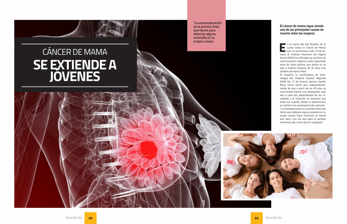 En el marco del Día Mundial de la Lucha contra el Cáncer de Mama , que se conmemora cada 19 de octubre , el Instituto Mexicano del Seguro Social ( IMSS ) ha reforzado las acciones de concienciación respecto a este importante tema de salud pública , que afecta ya no solo a mujeres mayores de 40 años , sino también de menor edad . Al respecto , la coordinadora de Ginecología del Hospital General Regional ( HGR ) No . 17 de Cancún , doctora Sandra Pérez Silvia , refirió que , independientemente de que a partir de los 40 años se recomienda realizar una mastografía cada año o cada dos ( dependiendo de los resultados y el historial ), es necesario que todas las mujeres , desde la adolescencia , se realicen una autoexploración mensual . “ La autoexploración es la primera línea que tienes para detectar alguna anomalía en tu propio cuerpo . Estas revisiones se tienen que hacer una vez que pasa el periodo menstrual , dos o tres días sin sangrado ”.