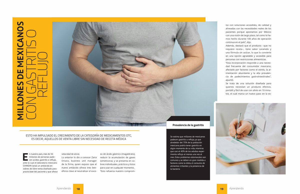 En nuestro país, más de 50 millones de personas padecen acidez, gastritis o reflujo, ante lo cual el laboratorio mexicano CHINOIN lanzó un antiácido en sobres de libre venta diseñado para practicidad del paciente y que ofrece velocidad de alivio. Lo anterior lo dio a conocer Zaira Orozco, business unit manager de la firma, quien expuso que el nuevo antiácido ofrece tres beneficios clave al neutralizar el exceso de ácido gástrico( magaldrato), reducir la acumulación de gases( simeticona), y se presenta en sobres individuales, prácticos y listos para usar en cualquier momento.“ Esto refuerza nuestro comprom-