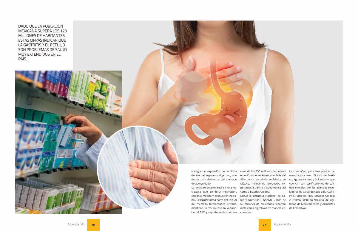 trategia de expansión de la firma dentro del segmento digestivo, uno de los más dinámicos del mercado de autocuidado. La decisión se enmarca en una estrategia que combina innovación, cercanía médica y producción nacional. CHINOIN forma parte del Top 20 del mercado farmacéutico privado, mantiene un crecimiento anual superior al 10 % y reporta ventas por encima de los 350 millones de dólares en el Continente Americano. Más del 85 % de su portafolio se fabrica en México, incluyendo productos exportados a Centro y Sudamérica, así como a Estados Unidos. Según la Encuesta Nacional de Salud y Nutrición( ENSANUT), más de 50 millones de mexicanos reportan malestares digestivos de manera recurrente.