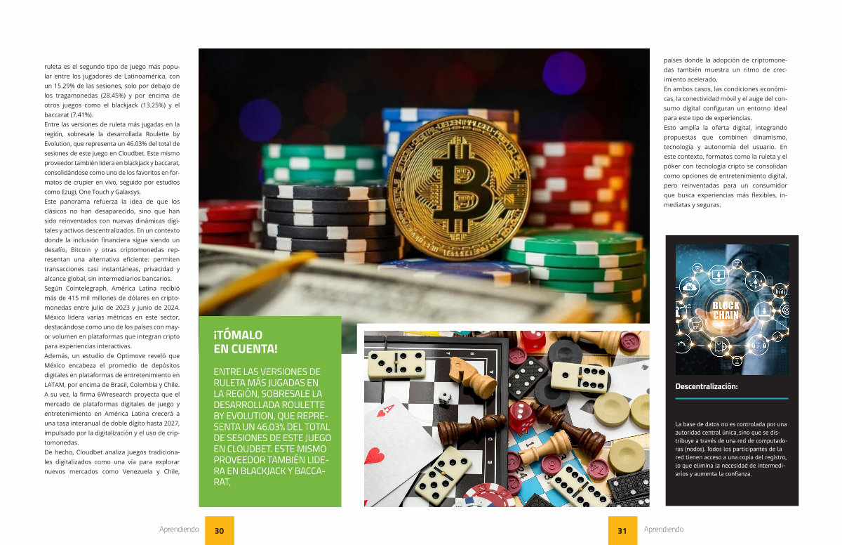 ruleta es el segundo tipo de juego más popular entre los jugadores de Latinoamérica, con un 15.29 % de las sesiones, solo por debajo de los tragamonedas( 28.45 %) y por encima de otros juegos como el blackjack( 13.25 %) y el baccarat( 7.41 %). Entre las versiones de ruleta más jugadas en la región, sobresale la desarrollada Roulette by Evolution, que representa un 46.03 % del total de sesiones de este juego en Cloudbet. Este mismo proveedor también lidera en blackjack y baccarat, consolidándose como uno de los favoritos en formatos de crupier en vivo, seguido por estudios como Ezugi, One Touch y Galaxsys. Este panorama refuerza la idea de que los clásicos no han desaparecido, sino que han sido reinventados con nuevas dinámicas digitales y activos descentralizados. En un contexto donde la inclusión financiera sigue siendo un desafío, Bitcoin y otras criptomonedas representan una alternativa eficiente: permiten transacciones casi instantáneas, privacidad y alcance global, sin intermediarios bancarios. Según Cointelegraph, América Latina recibió más de 415 mil millones de dólares en criptomonedas entre julio de 2023 y junio de 2024. México lidera varias métricas en este sector, destacándose como uno de los países con mayor volumen en plataformas que integran cripto para experiencias interactivas. Además, un estudio de Optimove reveló que México encabeza el promedio de depósitos digitales en plataformas de entretenimiento en LATAM, por encima de Brasil, Colombia y Chile. A su vez, la firma 6Wresearch proyecta que el mercado de plataformas digitales de juego y entretenimiento en América Latina crecerá a una tasa interanual de doble dígito hasta 2027, impulsado por la digitalización y el uso de criptomonedas. De hecho, Cloudbet analiza juegos tradicionales digitalizados como una vía para explorar nuevos mercados como Venezuela y Chile,
