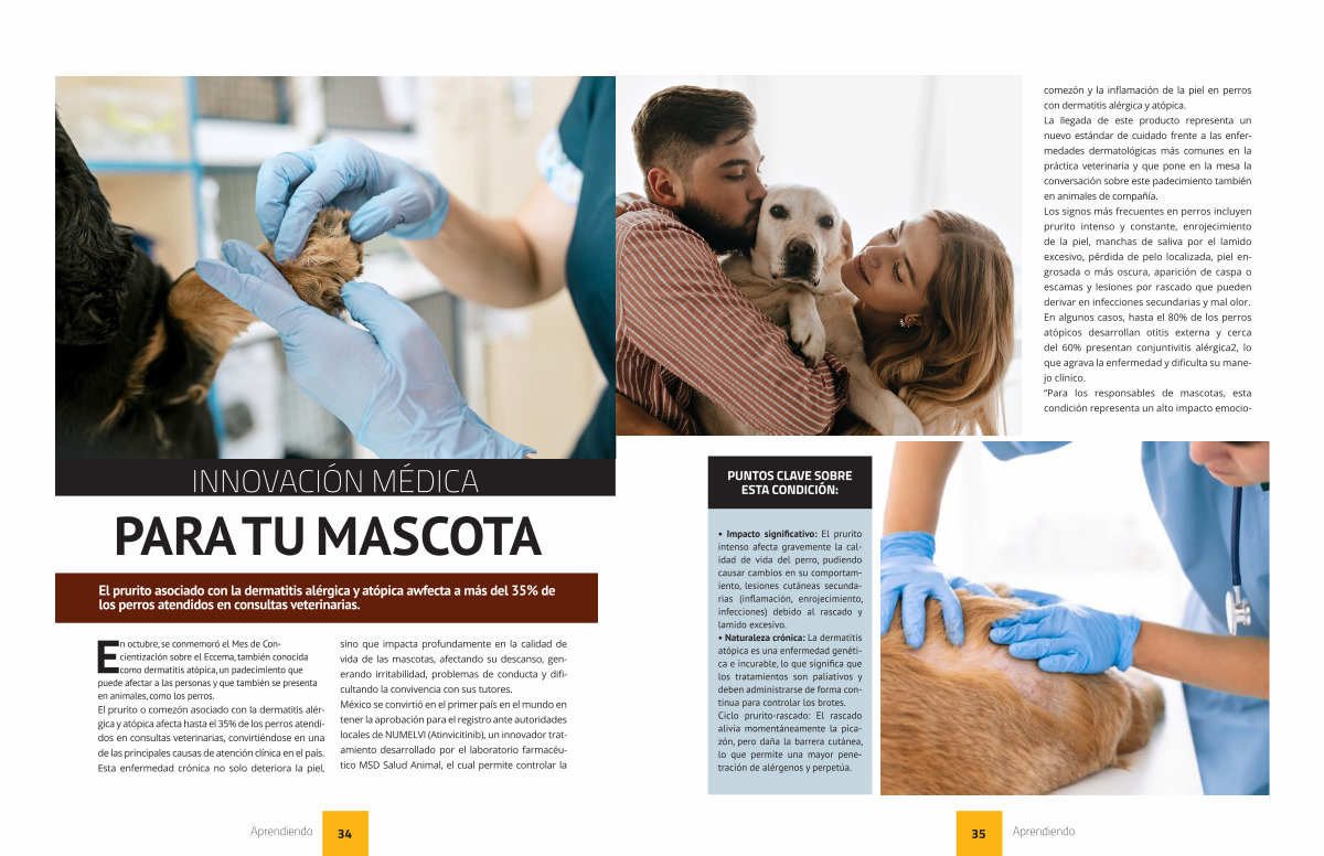 En octubre, se conmemoró el Mes de Concientización sobre el Eccema, también conocida como dermatitis atópica, un padecimiento que puede afectar a las personas y que también se presenta en animales, como los perros. El prurito o comezón asociado con la dermatitis alérgica y atópica afecta hasta el 35 % de los perros atendidos en consultas veterinarias, convirtiéndose en una de las principales causas de atención clínica en el país. Esta enfermedad crónica no solo deteriora la piel, sino que impacta profundamente en la calidad de vida de las mascotas, afectando su descanso, generando irritabilidad, problemas de conducta y dificultando la convivencia con sus tutores. México se convirtió en el primer país en el mundo en tener la aprobación para el registro ante autoridades locales de NUMELVI( Atinvicitinib), un innovador tratamiento desarrollado por el laboratorio farmacéutico MSD Salud Animal, el cual permite controlar la