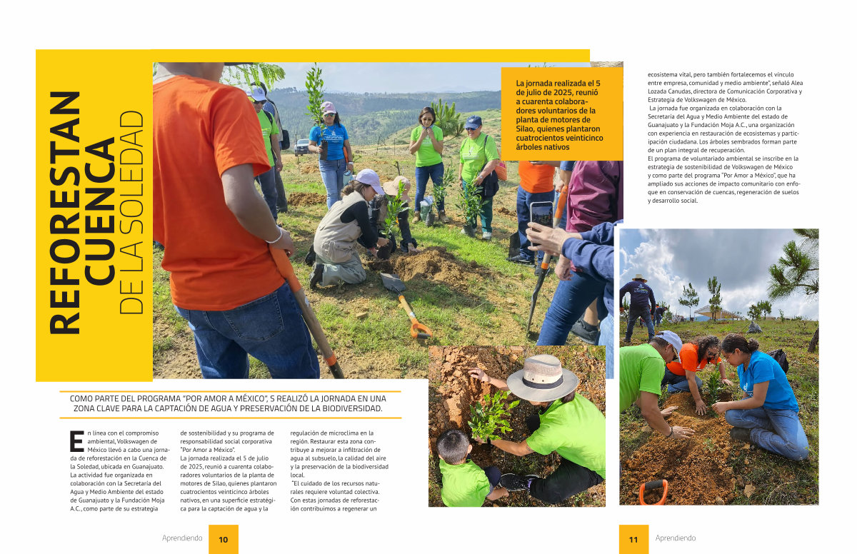 La jornada realizada el 5 de julio de 2025, reunió a cuarenta colaboradores voluntarios de la planta de motores de Silao, quienes plantaron cuatrocientos veinticinco árboles nativos ecosistema vital, pero también fortalecemos el vínculo entre empresa, comunidad y medio ambiente”, señaló Alea Lozada Canudas, directora de Comunicación Corporativa y Estrategia de Volkswagen de México. La jornada fue organizada en colaboración con la Secretaría del Agua y Medio Ambiente del estado de Guanajuato y la Fundación Moja A. C., una organización con experiencia en restauración de ecosistemas y participación ciudadana. Los árboles sembrados forman parte de un plan integral de recuperación. El programa de voluntariado ambiental se inscribe en la estrategia de sostenibilidad de Volkswagen de México y como parte del programa“ Por Amor a México”, que ha ampliado sus acciones de impacto comunitario con enfoque en conservación de cuencas, regeneración de suelos y desarrollo social.