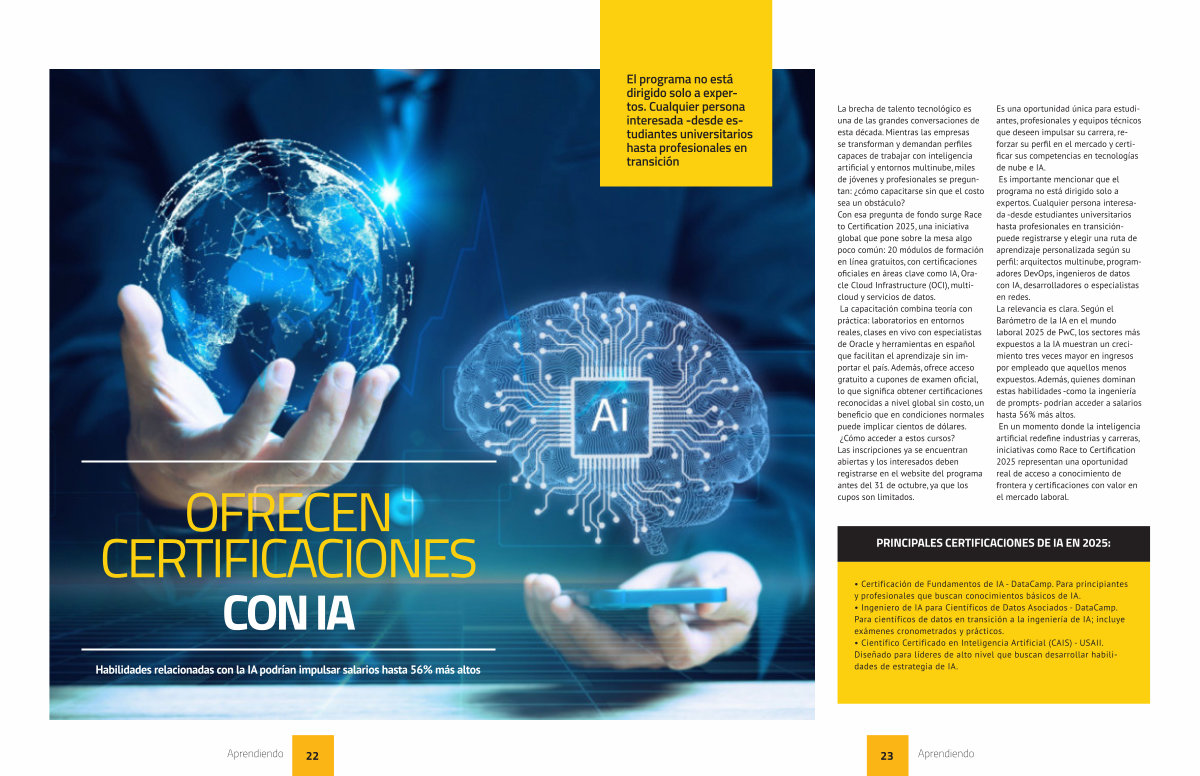 La brecha de talento tecnológico es una de las grandes conversaciones de esta década. Mientras las empresas se transforman y demandan perfiles capaces de trabajar con inteligencia artificial y entornos multinube, miles de jóvenes y profesionales se preguntan: ¿ cómo capacitarse sin que el costo sea un obstáculo? Con esa pregunta de fondo surge Race to Certification 2025, una iniciativa global que pone sobre la mesa algo poco común: 20 módulos de formación en línea gratuitos, con certificaciones oficiales en áreas clave como IA, Oracle Cloud Infrastructure( OCI), multicloud y servicios de datos. La capacitación combina teoría con práctica: laboratorios en entornos reales, clases en vivo con especialistas de Oracle y herramientas en español que facilitan el aprendizaje sin importar el país. Además, ofrece acceso gratuito a cupones de examen oficial, lo que significa obtener certificaciones reconocidas a nivel global sin costo, un beneficio que en condiciones normales puede implicar cientos de dólares. ¿ Cómo acceder a estos cursos? Las inscripciones ya se encuentran abiertas y los interesados deben registrarse en el website del programa antes del 31 de octubre, ya que los cupos son limitados.