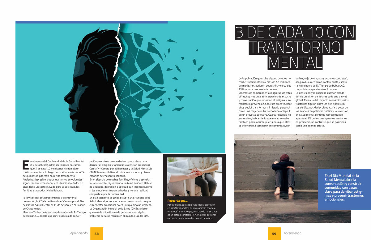 de la población que sufre alguno de ellos no recibe tratamiento. Hoy, más de 3.6 millones de mexicanos padecen depresión, y cerca del 19 % reporta una ansiedad severa.“ Además de comprender la magnitud de estas cifras, hoy nos urge abrir espacios de escucha y conversación que reduzcan el estigma y fomenten la prevención. Con este objetivo, hace años decidí transformar mi historia personal como una mujer con trastorno bipolar tipo 1 en un proyecto colectivo. Guardar silencio no era opción; hablar de lo que me atravesaba también podía abrir la puerta para que otros se atrevieran a compartir, en comunidad, con un lenguaje de empatía y acciones concretas”, aseguró Maureen Terán, conferencista, escritora y fundadora de Es Tiempo de Hablar A. C. Un problema que atraviesa fronteras La depresión y la ansiedad cuestan alrededor de un billón de dólares cada año a nivel global. Más allá del impacto económico, estos trastornos figuran entre las principales causas de discapacidad prolongada. Y a pesar de los avances en políticas públicas, la inversión en salud mental continúa representando apenas el 2 % de los presupuestos sanitarios en promedio, un contraste que se posiciona como una agenda crítica.