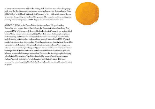 Marcelo Kuna is the Dance Editor for Apricity Press. He graduated in December, 2015 with a B.A. in Dance from the Communication of the Body Arts course at PUC-SP. He currently lives in São Paulo, Brazil. Dancer, singer and certified DanceAbility teacher (Montevideo, 2013), Marcelo is interested in exploring queer performativity, and the mixed abilities of (dis)abled bodies through the arts of the body. Recently, he finished an undergraduate research internship at PUC-SP which studied the connections between East-West through mantra chanting and dance. This was done in collaboration with his academic advisor and professor Gaby Imparato, who has been researching for the past 25 years her specific take on Martha Graham's technique, which directs contraction and release to the creation of artistic processes.