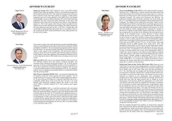 Peter Warren Automotive ( PWR ): PWR is an automotive dealership with 82 franchises across the volume , prestige and luxury segments . 1H ’ 22 results showed a 35 % increase in PBT and an inaugural interim dividend of 9c . We have followed AP Eagers for a long time and PWR looks to be a comparable smaller player in the sector . We have also had a very good meeting with Motorcycle Holdings ( MTO ) this month in the same sector . PWR is currently trading at $ 2.75 with consensus price targets around $ 4 .