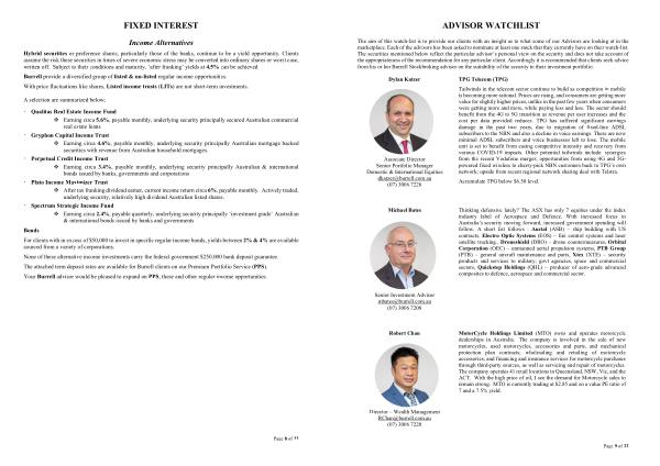 The aim of this watch-list is to provide our clients with an insight as to what some of our Advisors are looking at in the marketplace . Each of the advisors has been asked to nominate at least one stock that they currently have on their watch-list . The securities mentioned below reflect the particular advisor ’ s personal view on the security and does not take account of the appropriateness of the recommendation for any particular client . Accordingly it is recommended that clients seek advice from his or her Burrell Stockbroking advisor on the suitability of the security to their investment portfolio .