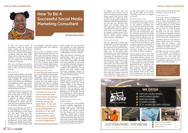 With these key tips , you can embark on your journey to becoming a successful social media marketing consultant . You will learn and grow along the way and also have unforgettable experiences that will propel you to greater heights . ■