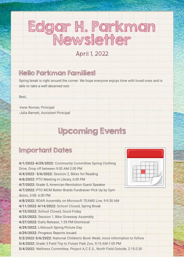 4 / 1 / 2022-4 / 29 / 2022 : Community Committee Spring Clothing Drive , Drop off between 9:00 AM-2:00 PM 4 / 4 / 2022- 5 / 6 / 2022 : Session 2 , Bikes for Reading 4 / 6 / 2022 : PTO Meeting in Library , 6:00 PM 4 / 7 / 2022 : Grade 5 , American Revolution Guest Speaker 4 / 7 / 2022 : PTO MCM Butter Braids Fundraiser Pick Up by Gym doors , 3:00- 6:00 PM 4 / 8 / 2022 : ROAR Assembly on Microsoft TEAMS Live , 9-9:30 AM 4 / 11 / 2022-4 / 14 / 2022 : School Closed , Spring Break 4 / 15 / 2022 : School Closed , Good Friday 4 / 25 / 2022 : Session 1 , Bike Giveaway Assembly 4 / 27 / 2022 : Early Release , 1:35 PM Dismissal 4 / 29 / 2022 : Lifetouch Spring Picture Day 4 / 29 / 2022 : Progress Reports Issued 5 / 2 / 2022-5 / 6 / 2022 : National Children ’ s Book Week , more information to follow 5 / 4 / 2022 : Grade 3 Field Trip to Forest Park Zoo , 9:15 AM-1:00 PM 5 / 4 / 2022 : Wellness Committee , Project A . C . E . S ., North Field Outside , 2:15-2:30