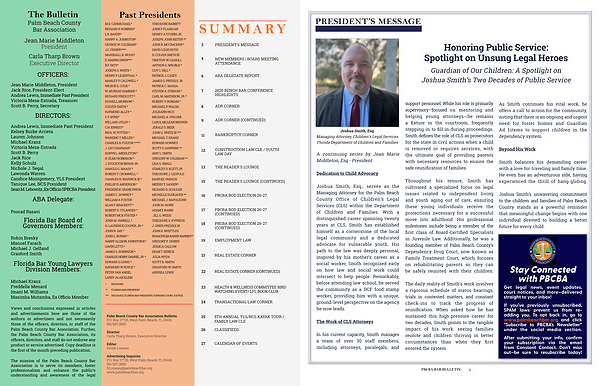 Views and conclusions expressed in articles and advertisements here are those of the authors or advertisers and not necessarily those of the officers, directors, or staff of the Palm Beach County Bar Association. Further, the Palm Beach County Bar Association, its officers, directors, and staff do not endorse any product or service advertised. Copy deadline is the first of the month preceding publication.