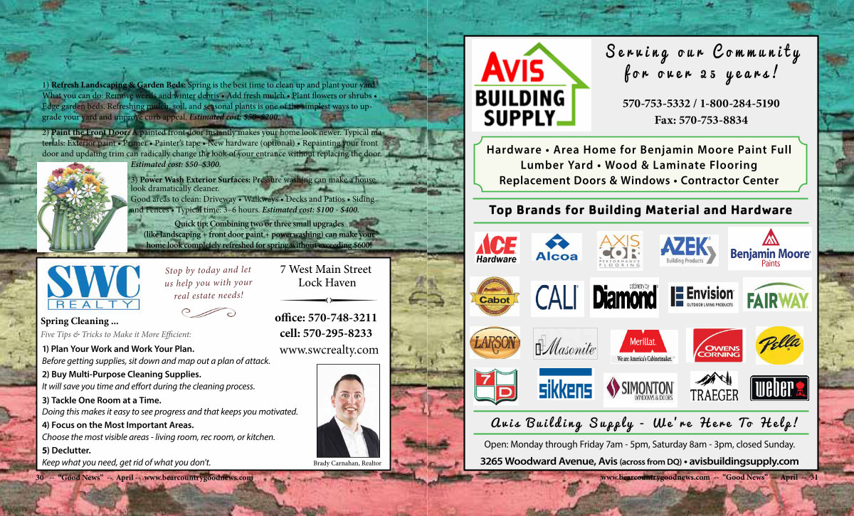 Open: Monday through Friday 7am- 5pm, Saturday 8am- 3pm, closed Sunday. 3265 Woodward Avenue, Avis( across from DQ) • avisbuildingsupply. com www. bearcountrygoodnews. com--“ Good News”-- April-- 31