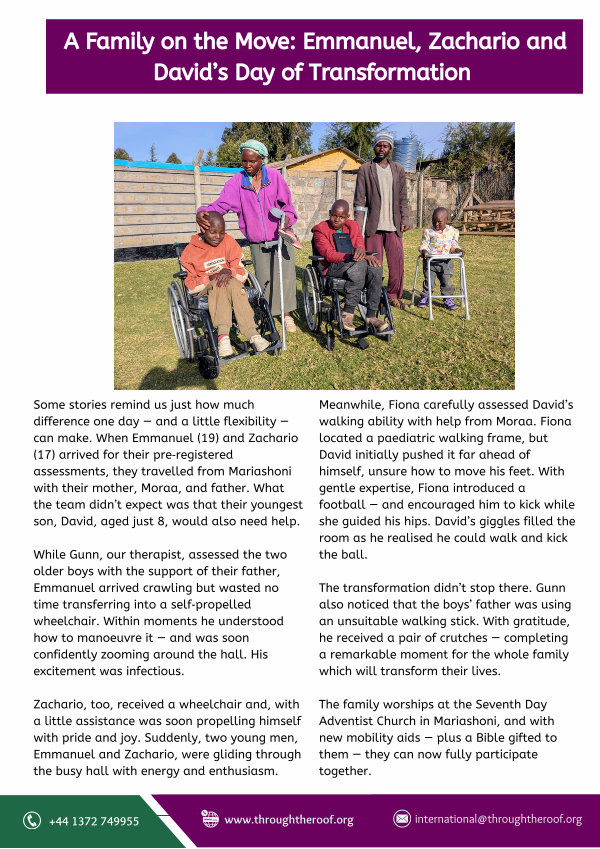 Some stories remind us just how much difference one day— and a little flexibility— can make. When Emmanuel( 19) and Zachario( 17) arrived for their pre‐registered assessments, they travelled from Mariashoni with their mother, Moraa, and father. What the team didn’ t expect was that their youngest son, David, aged just 8, would also need help.