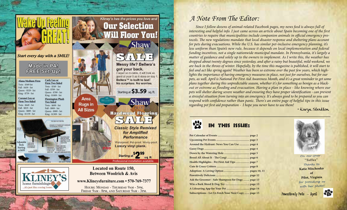 Since I follow dozens of animal-related Facebook pages, my news feed is always full of interesting and helpful info. I just came across an article about Spain becoming one of the first countries to require that municipalities include companion animals in official emergency protocols. The new regulations mandate that local disaster response and sheltering plans account for pets during evacuations. While the U. S. has similar pet-inclusive emergency planning, it’ s less uniform than Spain’ s new rule, because it depends on local implementation and federal funding incentives, not a single nationwide municipal mandate. In Pennsylvania, it ' s largely a matter of guidance and solely up to the owners to implement. As I write this, the weather has dropped about twenty degrees since yesterday, and after a rainy but beautiful, mild weekend, we are back in the throes of winter. Hopefully, by the time this magazine is published, it will start to feel and act like spring again! Weather has been so extreme over the past few years, which highlights the importance of having emergency measures in place, not just for ourselves, but for our pets, as well. April is National Pet First Aid Awareness Month, and it ' s a great reminder to get some plans together during this unpredictable season, whether it ' s for something as benign as a blackout or extreme as flooding and evacuation. Having a plan in place- like knowing where our pets will shelter during severe weather and ensuring they have proper identification- can prevent a stressful situation from turning into an emergency. It ' s always good to be prepared so you can respond with confidence rather than panic. There ' s an entire page of helpful tips in this issue regarding pet first aid preparation- I hope you never have to use them!