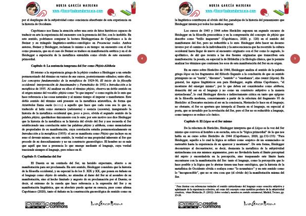 Capobianco nos llama la atención sobre una serie de hitos históricos capaces de traducir en arte la experiencia del encuentro con la presencia del Ser , con lo inefable . En este sentido , podríamos comparar la lectura Heideggeriana de Capobianco a la de Steiner y su triángulo lingüístico-estético-ontológico en Presencias reales . Ambos autores , Steiner y Heidegger , reclaman lo mismo a su tiempo : un encuentro con el Ser como presencia , que en el caso de Steiner se traduce en manifestación estética y en el de Heidegger a superación de la metafísica entendida como olvido de este encuentro primordial .