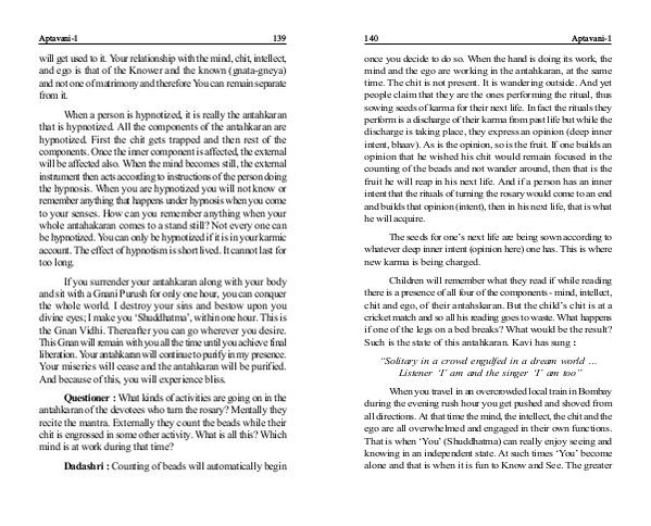 Questioner: What kinds of activities are going on in the antahkaran of the devotees who turn the rosary? Mentally they recite the mantra. Externally they count the beads while their chit is engrossed in some other activity. What is all this? Which mind is at work during that time?