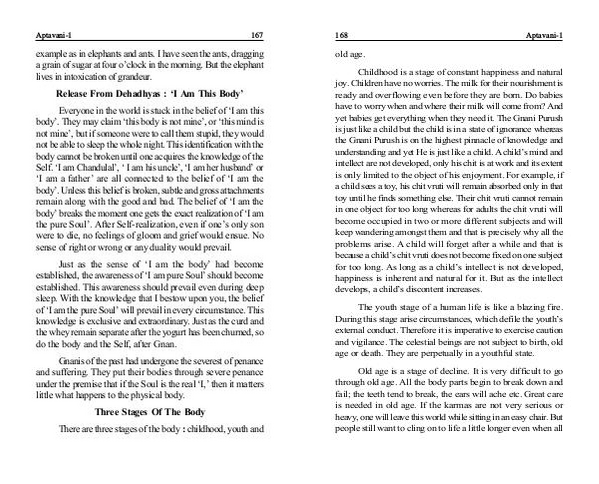 Everyone in the world is stuck in the belief of‘ I am this body’. They may claim‘ this body is not mine’, or‘ this mind is not mine’, but if someone were to call them stupid, they would not be able to sleep the whole night. This identification with the body cannot be broken until one acquires the knowledge of the Self.‘ I am Chandulal’,‘ I am his uncle’,‘ I am her husband’ or‘ I am a father’ are all connected to the belief of‘ I am the body’. Unless this belief is broken, subtle and gross attachments remain along with the good and bad. The belief of‘ I am the body’ breaks the moment one gets the exact realization of‘ I am the pure Soul’. After Self-realization, even if one’ s only son were to die, no feelings of gloom and grief would ensue. No sense of right or wrong or any duality would prevail.
