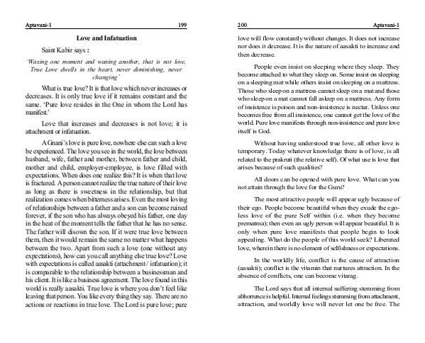 A Gnani’ s love is pure love, nowhere else can such a love be experienced. The love you see in the world, the love between husband, wife, father and mother, between father and child, mother and child, employer-employee, is love filled with expectations. When does one realize this? It is when that love is fractured. A person cannot realize the true nature of their love as long as there is sweetness in the relationship, but that realization comes when bitterness arises. Even the most loving of relationships between a father and a son can become ruined forever, if the son who has always obeyed his father, one day in the heat of the moment tells the father that he has no sense. The father will disown the son. If it were true love between them, then it would remain the same no matter what happens between the two. Apart from such a love( one without any expectations), how can you call anything else true love? Love with expectations is called aasakti( attachment / infatuation); it is comparable to the relationship between a businessman and his client. It is like a business agreement. The love found in this world is really aasakti. True love is where you don’ t feel like leaving that person. You like every thing they say. There are no actions or reactions in true love. The Lord is pure love; pure