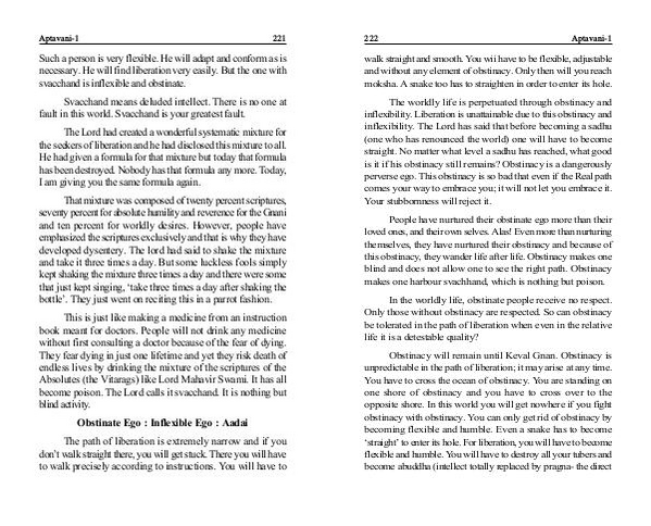 That mixture was composed of twenty percent scriptures, seventy percent for absolute humility and reverence for the Gnani and ten percent for worldly desires. However, people have emphasized the scriptures exclusively and that is why they have developed dysentery. The lord had said to shake the mixture and take it three times a day. But some luckless fools simply kept shaking the mixture three times a day and there were some that just kept singing,‘ take three times a day after shaking the bottle’. They just went on reciting this in a parrot fashion.