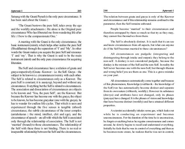 The Self and circumstance have a relation of gnata and gneya respectively( Gnata- Knower – i. e. the Self. Gneya – the subject to be known i. e. circumstances / events), with each other. The Self is related to circumstances only as a Knower. The pure Self is constant; it is asanyogi, beyond and without any circumstance. Everything but the Self is related to circumstances. The association and dissociation of circumstances are objects to be known and‘ You, the pure Self’, are the Knower. But because the Knower has become one with the gneya, the object to be known, he has become gneyakar( one with the gneya), he has to wander for endless life cycles. That which is seen and experienced through the five senses is tangible( sthool) circumstance, the subtle circumstance of the inner complex( antahskaran: the mind, intellect, chit and ego), and the circumstance of speech – are all with which the Self is associated only through the relationship of association. The Self is not‘ married’( bound) to those circumstances. The relationship of the Self with these three is not binding. There is no real or inseparable relationship between the Self and the circumstances.