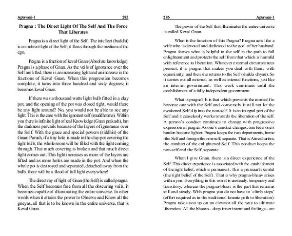 What is pragna? It is that which prevents the non-self to become one with the Self and conversely it will not let the awakened Self slip into the non-self. It is an integral part of the Self and it ceaselessly works towards the liberation of the self. A person’ s conduct continues to change with progressive expression of pragna. As one’ s conduct changes, one feels one’ s burden become lighter. Pragna keeps the two departments, home-the Self and foreign-the non-self, separate. That is Atmacharitra, the conduct of the enlightened Self. This conduct keeps the non-self and the Self, separate.