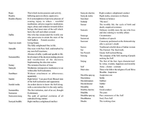 Samkit moha An ardent desire to know the Self along with a conviction that it is the only reality. Samrambha The first initiation, start of an act, thought Samsaran Evolutionary Samsaran marg The path of spiritual evolution of all embodied living entities Samyak buddhi Right intellect; enlightened intellect