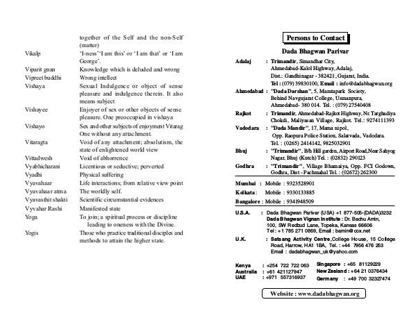 U. S. A.: Dada Bhagwan Parivar( USA) + 1 877-505-( DADA) 3232 Dada Bhagwan Vignan Institute: Dr. Bachu Amin, 100, SW Redbud Lane, Topeka, Kansas 66606 Tel: + 1 785 271 0869, Email: bamin @ cox. net