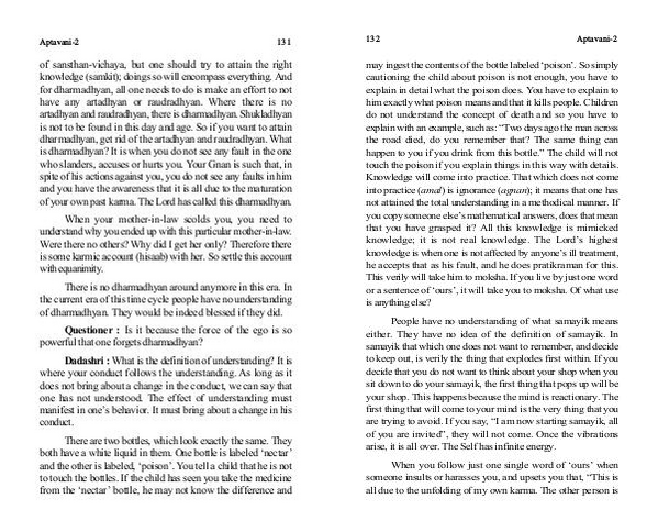 may ingest the contents of the bottle labeled‘ poison’. So simply cautioning the child about poison is not enough, you have to explain in detail what the poison does. You have to explain to him exactly what poison means and that it kills people. Children do not understand the concept of death and so you have to explain with an example, such as:“ Two days ago the man across the road died, do you remember that? The same thing can happen to you if you drink from this bottle.” The child will not touch the poison if you explain things in this way with details. Knowledge will come into practice. That which does not come into practice( amal) is ignorance( agnan); it means that one has not attained the total understanding in a methodical manner. If you copy someone else’ s mathematical answers, does that mean that you have grasped it? All this knowledge is mimicked knowledge; it is not real knowledge. The Lord’ s highest knowledge is when one is not affected by anyone’ s ill treatment, he accepts that as his fault, and he does pratikraman for this. This verily will take him to moksha. If you live by just one word or a sentence of‘ ours’, it will take you to moksha. Of what use is anything else?