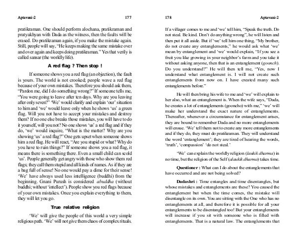 He will then bring his wife to me and‘ we’ will explain to her also, what an entanglement is. When the wife says,“ Dada, he creates a lot of entanglements( gooncho) with me,”‘ we’ will make her understand the exact nature of entanglements. Thereafter, whenever a circumstance for entanglement arises, they are bound to remember Dada and no more entanglements will ensue.‘ We’ tell them not to create any more entanglements and if they do, they must do pratikraman. They will understand the word‘ entanglement’; they are tired of hearing the words,‘ truth’,‘ compassion’‘ do not steal.’