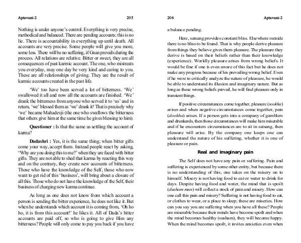 The Self does not have any pain or suffering. Pain and suffering is experienced by some other entity, but because there is no understanding of this, one takes on the misery on to himself. Misery is not having food to eat or water to drink for days. Despite having food and water, the mind that is spoilt( dusham mun) will collect a stock of pain and misery. How can one call this pain and misery? Suffering is not having food to eat, or clothes to wear, or a place to sleep; these are miseries. How can you say you are suffering when you have all these? People are miserable because their minds have become spoilt and when the mind becomes healthy( susham), they will become happy. When the mind becomes spoilt, it invites anxieties even when
