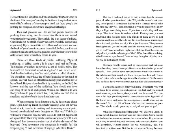 There are three kinds of painful suffering. Physical suffering is called‘ kasht’; it is direct and real suffering. Toothaches, eye aches, paralysis etc. are all bodily pains. The hurt suffered from harsh words is a‘ ghaa’. It will never leave. And the third suffering is of the mind, which is called‘ dookha’. We should no longer have the effect of pain due to the mind or speech. We will have an effect from bodily pain and this has to be suffered. But you should suffer it by remaining as the Self, the knower and the seer of the suffering. You should not have suffering of the mind and speech. When a tax officer tells you that you have to pay so much tax, it is just a‘ record’ that is speaking and therefore it should not hurt you.