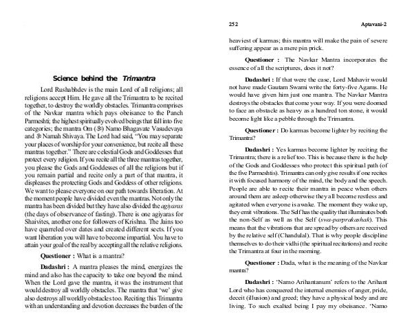 Dadashri: A mantra pleases the mind, energizes the mind and also has the capacity to take one beyond the mind. When the Lord gave the mantra, it was the instrument that would destroy all worldly obstacles. The mantra that‘ we’ give also destroys all worldly obstacles too. Reciting this Trimantra with an understanding and devotion decreases the burden of the