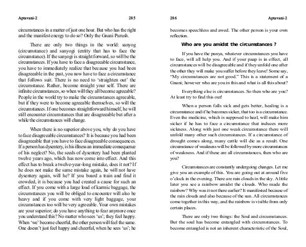 There are only two things in the world: sanyog( circumstance) and sanyogi( entity that has to face the circumstance). If the sanyogi is straight forward, so will be the circumstances. If you have to face a disagreeable circumstance, you have to immediately realize that because you had been disagreeable in the past, you now have to face a circumstance that follows suit. There is no need to‘ straighten out’ the circumstance. Rather, become straight your self. There are infinite circumstances, so when will they all become agreeable? People in the world try to make the circumstances agreeable, but if they were to become agreeable themselves, so will the circumstances. If one becomes straightforward himself, he will still encounter circumstances that are disagreeable but after a while the circumstances will change.