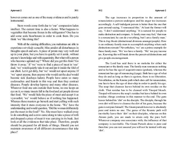 With all the existing difficulties, you mahatmas are able to experience nirvikalp samadhi; bliss amidst all disturbances in thoughts speech and acts. A piece of potato may very well end up in your plate, but you have to quietly set it aside, without anyone’ s knowledge and with equanimity. But what will a person who becomes agitated say?‘ Where did you get this from? Go throw it away.’ If‘ we’ were to find a piece of meat in‘ our’ daal,‘ we’ would quietly take it out and put it inside the fold of our dhoti. Let it get dirty, but‘ we’ would not upset anyone. If‘ we’ upset anyone, then anyone who would eat the daal would become sick( kashaya laden). People have eaten so many cockroaches and lizards in this way and then they contract diseases. People develop leprosy and many other diseases. Whatever food one eats outside their home, no one keeps an eye on it, so many insects fall in the food and yet people devour that food.‘ We’ would hide the piece of meat and accept it as vyavasthit;‘ we’ would behave as if nothing has happened. Whereas these masters go berserk and start yelling with such intensity that it stuns everyone in the home.‘ We’ have the understanding and would question,‘ Did the woman deliberately put the meat in the food?’ No. She must have walked away to do something and a crow came along to take a piece of rotli and dropped a piece of meat it was carrying in its beak. Just look at all the evidences that take place. Therefore, people should be prepared for all kinds of things. Should you not maintain awareness of all different circumstances that take place?