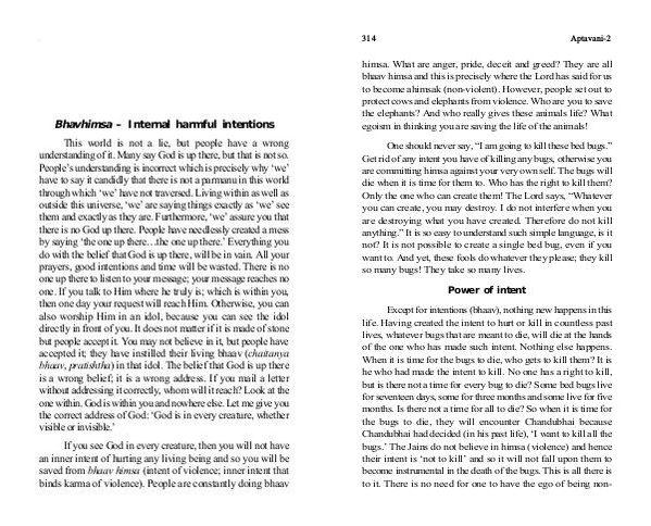 Except for intentions( bhaav), nothing new happens in this life. Having created the intent to hurt or kill in countless past lives, whatever bugs that are meant to die, will die at the hands of the one who has made such intent. Nothing else happens. When it is time for the bugs to die, who gets to kill them? It is he who had made the intent to kill. No one has a right to kill, but is there not a time for every bug to die? Some bed bugs live for seventeen days, some for three months and some live for five months. Is there not a time for all to die? So when it is time for the bugs to die, they will encounter Chandubhai because Chandubhai had decided( in his past life),‘ I want to kill all the bugs.’ The Jains do not believe in himsa( violence) and hence their intent is‘ not to kill’ and so it will not fall upon them to become instrumental in the death of the bugs. This is all there is to it. There is no need for one to have the ego of being non-