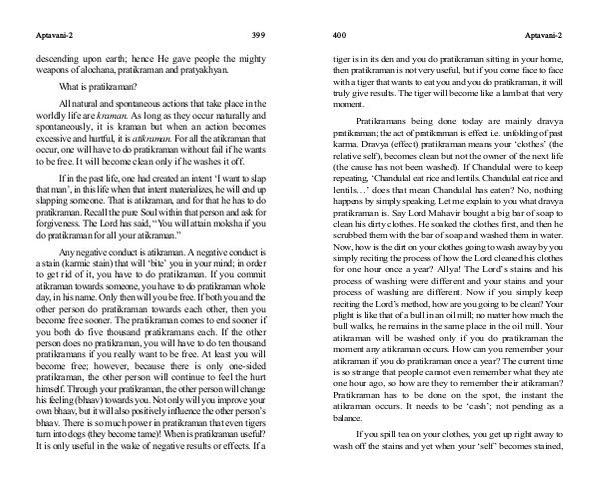 Pratikramans being done today are mainly dravya pratikraman; the act of pratikraman is effect i. e. unfolding of past karma. Dravya( effect) pratikraman means your‘ clothes’( the relative self), becomes clean but not the owner of the next life( the cause has not been washed). If Chandulal were to keep repeating,‘ Chandulal eat rice and lentils. Chandulal eat rice and lentils …’ does that mean Chandulal has eaten? No, nothing happens by simply speaking. Let me explain to you what dravya pratikraman is. Say Lord Mahavir bought a big bar of soap to clean his dirty clothes. He soaked the clothes first, and then he scrubbed them with the bar of soap and washed them in water. Now, how is the dirt on your clothes going to wash away by you simply reciting the process of how the Lord cleaned his clothes for one hour once a year? Allya! The Lord’ s stains and his process of washing were different and your stains and your process of washing are different. Now if you simply keep reciting the Lord’ s method, how are you going to be clean? Your plight is like that of a bull in an oil mill; no matter how much the bull walks, he remains in the same place in the oil mill. Your atikraman will be washed only if you do pratikraman the moment any atikraman occurs. How can you remember your atikraman if you do pratikraman once a year? The current time is so strange that people cannot even remember what they ate one hour ago, so how are they to remember their atikraman? Pratikraman has to be done on the spot, the instant the atikraman occurs. It needs to be‘ cash’; not pending as a balance.