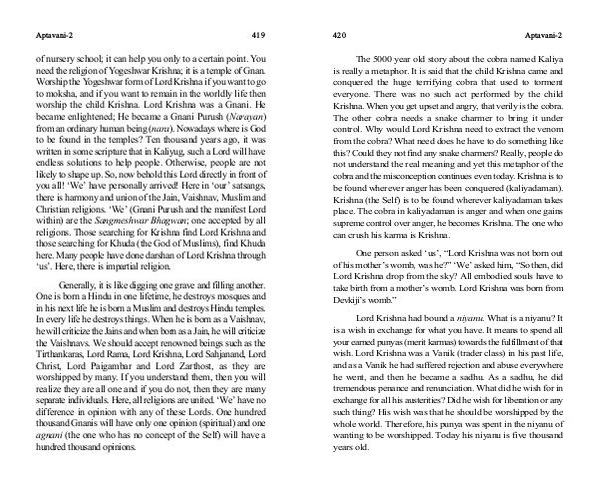 of nursery school; it can help you only to a certain point. You need the religion of Yogeshwar Krishna; it is a temple of Gnan. Worship the Yogeshwar form of Lord Krishna if you want to go to moksha, and if you want to remain in the worldly life then worship the child Krishna. Lord Krishna was a Gnani. He became enlightened; He became a Gnani Purush( Narayan) from an ordinary human being( nara). Nowadays where is God to be found in the temples? Ten thousand years ago, it was written in some scripture that in Kaliyug, such a Lord will have endless solutions to help people. Otherwise, people are not likely to shape up. So, now behold this Lord directly in front of you all!‘ We’ have personally arrived! Here in‘ our’ satsangs, there is harmony and union of the Jain, Vaishnav, Muslim and Christian religions.‘ We’( Gnani Purush and the manifest Lord within) are the Sangmeshwar Bhagwan; one accepted by all religions. Those searching for Krishna find Lord Krishna and those searching for Khuda( the God of Muslims), find Khuda here. Many people have done darshan of Lord Krishna through‘ us’. Here, there is impartial religion.