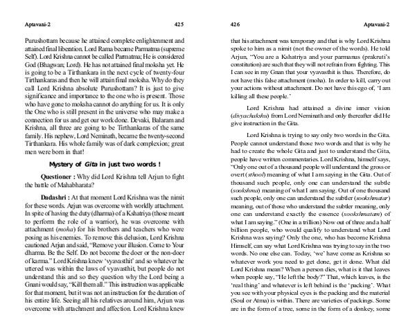 Dadashri: At that moment Lord Krishna was the nimit for these words. Arjun was overcome with worldly attachment. In spite of having the duty( dharma) of a Kshatriya( those meant to perform the role of a warrior), he was overcome with attachment( moha) for his brothers and teachers who were posing as his enemies. To remove this delusion, Lord Krishna cautioned Arjun and said,“ Remove your illusion. Come to Your dharma. Be the Self. Do not become the doer or the non-doer of karma.” Lord Krishna knew‘ vyavasthit’ and so whatever he uttered was within the laws of vyavasthit, but people do not understand this and so they question why the Lord being a Gnani would say,“ Kill them all.” This instruction was applicable for that moment, but it was not an instruction for the duration of his entire life. Seeing all his relatives around him, Arjun was overcome with attachment and affection. Lord Krishna knew