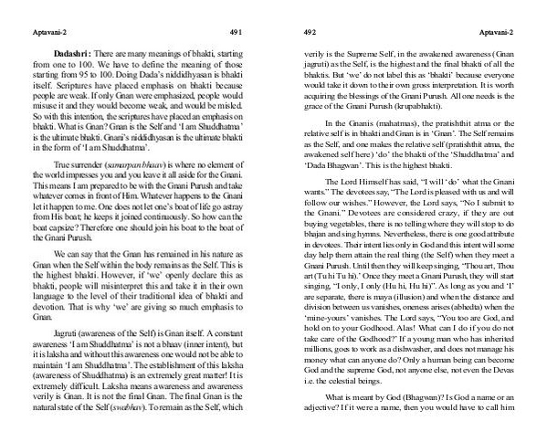 In the Gnanis( mahatmas), the pratishthit atma or the relative self is in bhakti and Gnan is in‘ Gnan’. The Self remains as the Self, and one makes the relative self( pratishthit atma, the awakened self here)‘ do’ the bhakti of the‘ Shuddhatma’ and‘ Dada Bhagwan’. This is the highest bhakti.