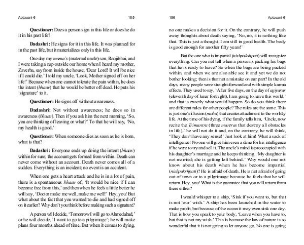 Dadashri: Everyone ends up doing the intent( bhaav) within for sure; the account gets formed from within. Death can never come without an account. Death never comes all of a sudden. Everything is an incident; no event is an accident.
