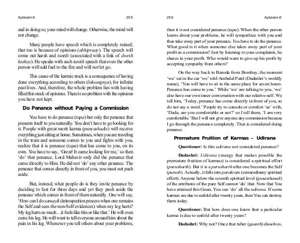 You have to do penance( tapa) but only the penance that presents itself to you naturally. You don’ t have to go looking for it. People with great merit karma( punyashadis) will receive everything just sitting at home. Sometimes, when you are traveling in the train and someone comes to you and fights with you, realize that it is penance( tapa) that has come to you, on its own. You have to say,‘ Great! It came looking for me,’ so then‘ do’ that penance. Lord Mahavir only did the penance that came directly to Him. He did not‘ do’ any other penance. The penance that comes directly in front of you, you must not push aside.
