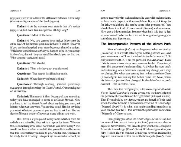 The Gnan that‘ we’ give you, is the knowledge of Absolute Vision( Keval Darshan); we are giving you the knowledge of the permanent conviction of the right belief( kshayak samkit). Then if you abide by my Agnas, you get the benefit of both. And when does that become a permanent conviction of Knowledge( kshayak Gnan)? It is when that understanding manifests in your conduct( vartan) – that is when the permanent conviction( kshayak) of Gnan occurs.
