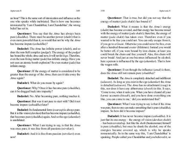 Dadashri: The Atma has infinite power( shakti), and so does the non-Self complex( pudgal). The energy of the pudgal has bound the whole Atma and now, it will not let it go. Therefore, even the non-living matter( jada) has infinite energy. Have you not seen an atomic bomb explosion? So even matter( jada) has infinite energy.
