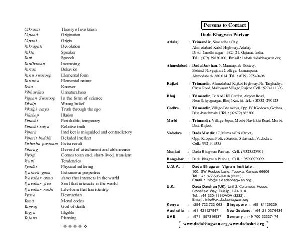 Utkranti Theory of evolution Utpaad Origination Utpatti Origin Vakragati Devolution Vakta Speaker Vani Speech Vardhaman Increasing Vartan Behavior Vastu swaroop Elemental form Vastutva Elemental nature Vetta Knower Vibhavikta Unnaturalness Vignan Swaroop In the form of science Vikalp Wrong belief Vikalpi satya Truth through the ego Vikshep Illusion Vinashi Perishable, temporary Vinashi satya Relative truth Viparit Intellect is misguided and contradictory Viparit buddhi Deluded intellect Vishesha parinam Extra result Vitarag Devoid of attachment and abhorrence Viyogi Comes to an end, short-lived, transient Vrutti Tendencies Vyadhi Physical suffering Vyatirek guna Extraneous properties Vyavahar atma Atma that interacts in the world Vyavahar jiva Soul that interacts in the world Vyavahar rashi Life-form that has identity Vyaya Destruction Yama Moral codes Yamraj God of death Yogya Eligible Yojana Planning �����