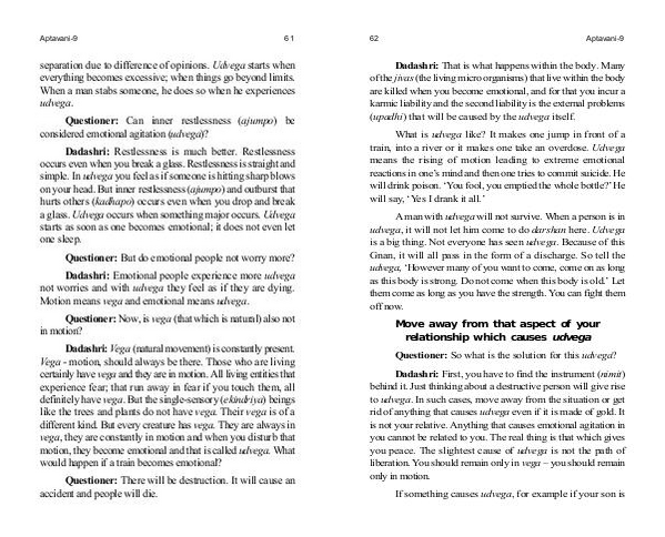 Dadashri: Vega( natural movement) is constantly present. Vega- motion, should always be there. Those who are living certainly have vega and they are in motion. All living entities that experience fear; that run away in fear if you touch them, all definitely have vega. But the single-sensory( ekindriya) beings like the trees and plants do not have vega. Their vega is of a different kind. But every creature has vega. They are always in vega, they are constantly in motion and when you disturb that motion, they become emotional and that is called udvega. What would happen if a train becomes emotional?