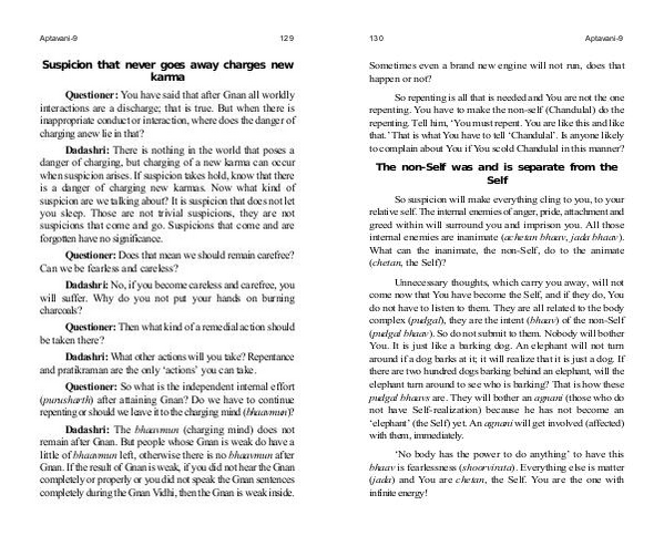 Dadashri: There is nothing in the world that poses a danger of charging, but charging of a new karma can occur when suspicion arises. If suspicion takes hold, know that there is a danger of charging new karmas. Now what kind of suspicion are we talking about? It is suspicion that does not let you sleep. Those are not trivial suspicions, they are not suspicions that come and go. Suspicions that come and are forgotten have no significance.