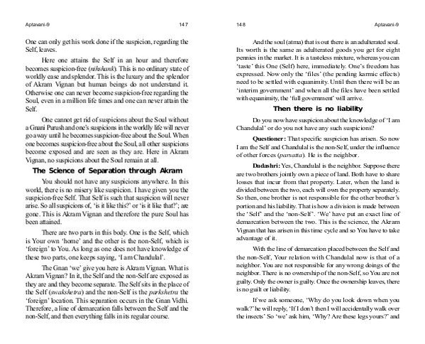 Dadashri: Yes, Chandulal is the neighbor. Suppose there are two brothers jointly own a piece of land. Both have to share losses that incur from that property. Later, when the land is divided between the two, each will own the property separately. So then, one brother is not responsible for the other brother’ s portion and his liability. That is how a division is made between the‘ Self’ and the‘ non-Self’.‘ We’ have put an exact line of demarcation between the two. This is the science, the Akram Vignan that has arisen in this time cycle and so You have to take advantage of it.