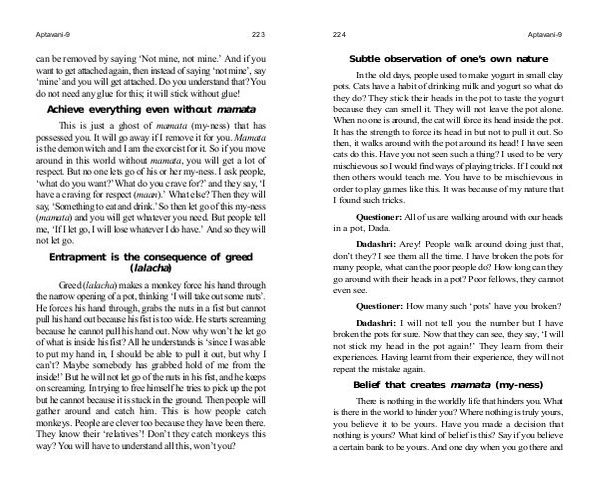 Greed( lalacha) makes a monkey force his hand through the narrow opening of a pot, thinking‘ I will take out some nuts’. He forces his hand through, grabs the nuts in a fist but cannot pull his hand out because his fist is too wide. He starts screaming because he cannot pull his hand out. Now why won’ t he let go of what is inside his fist? All he understands is‘ since I was able to put my hand in, I should be able to pull it out, but why I can’ t? Maybe somebody has grabbed hold of me from the inside!’ But he will not let go of the nuts in his fist, and he keeps on screaming. In trying to free himself he tries to pick up the pot but he cannot because it is stuck in the ground. Then people will gather around and catch him. This is how people catch monkeys. People are clever too because they have been there. They know their‘ relatives’! Don’ t they catch monkeys this way? You will have to understand all this, won’ t you?